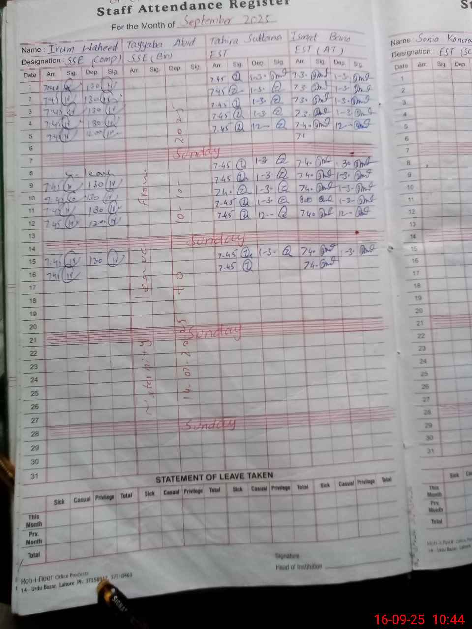 | CNIC | Full Name | Designation | R/C | Absence During Last Calender Month |