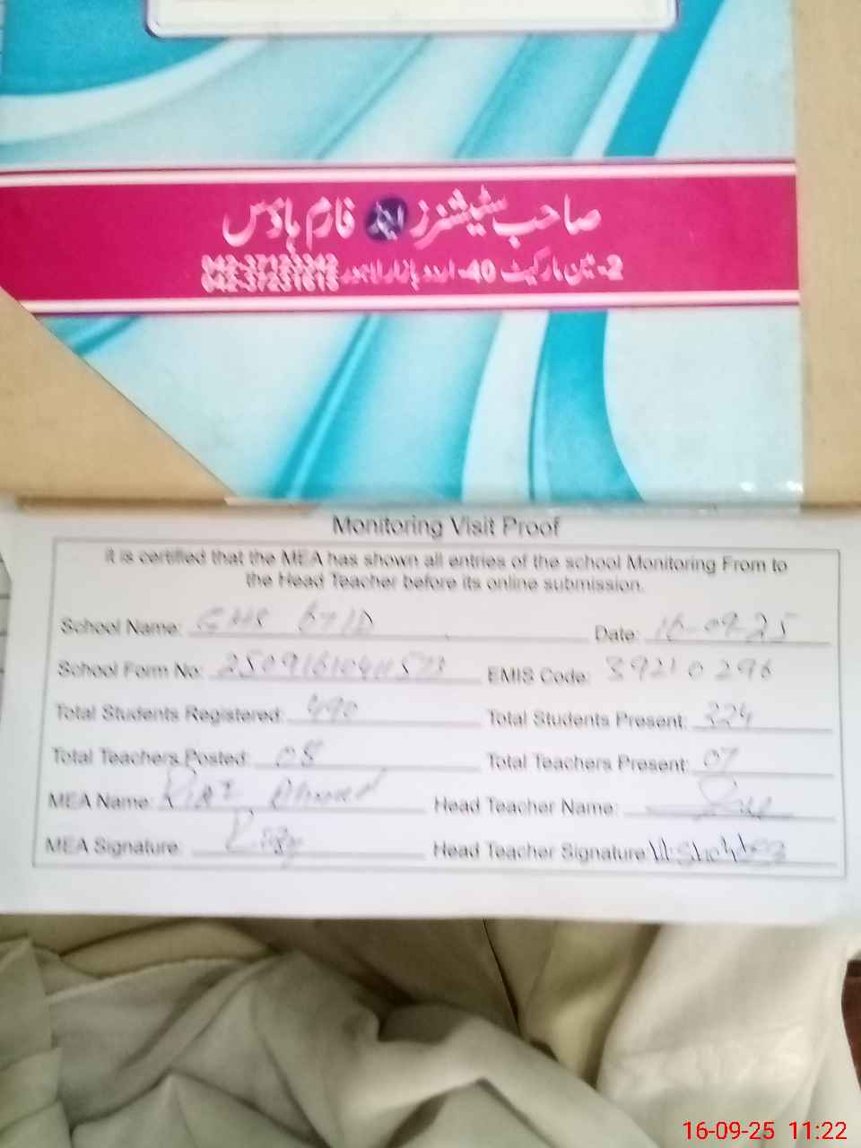 | Attendance Register | Head Teacher | MEA with School | Visit Proof |