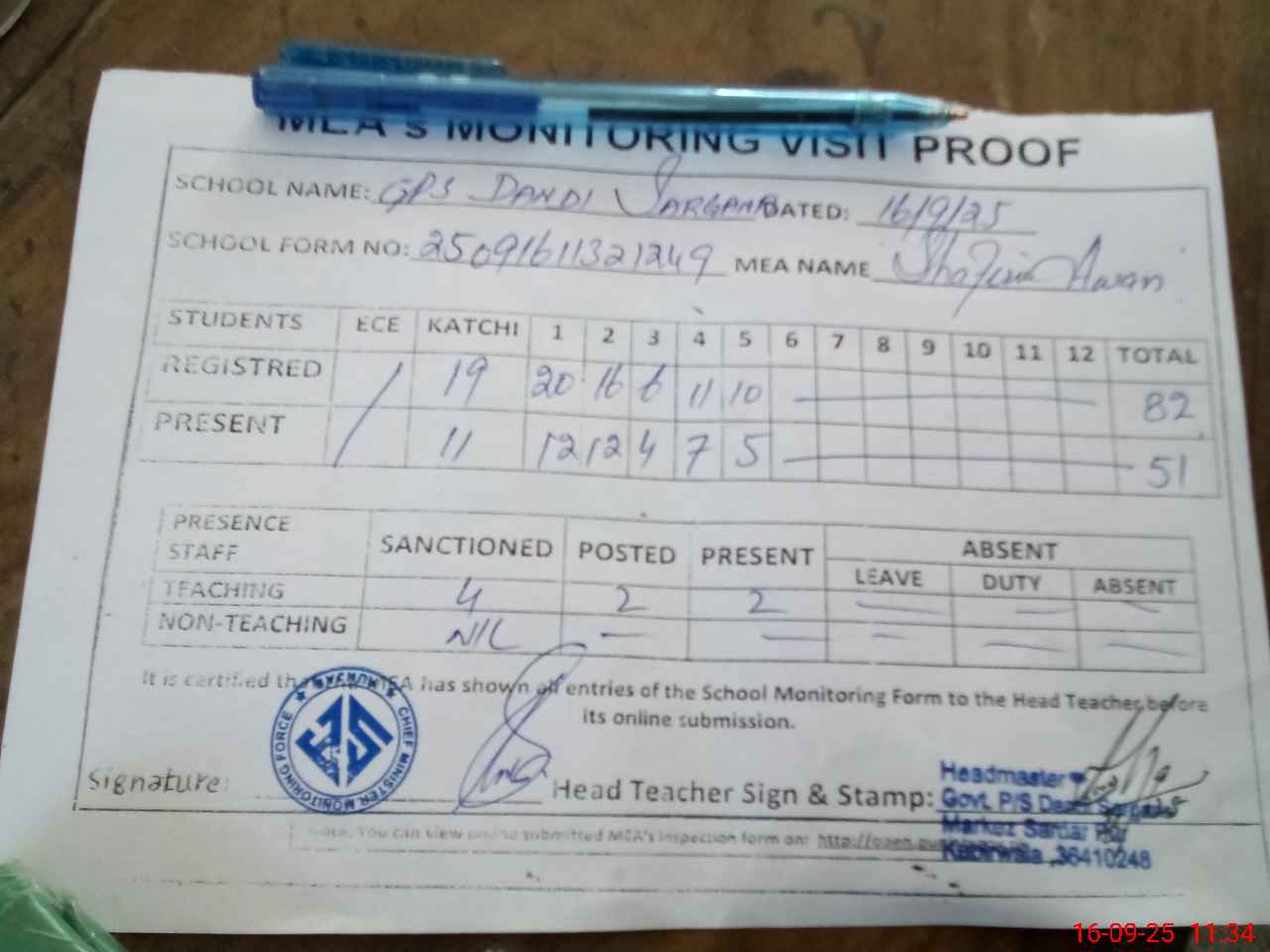 | Attendance Register | Head Teacher | MEA with School | Visit Proof |
