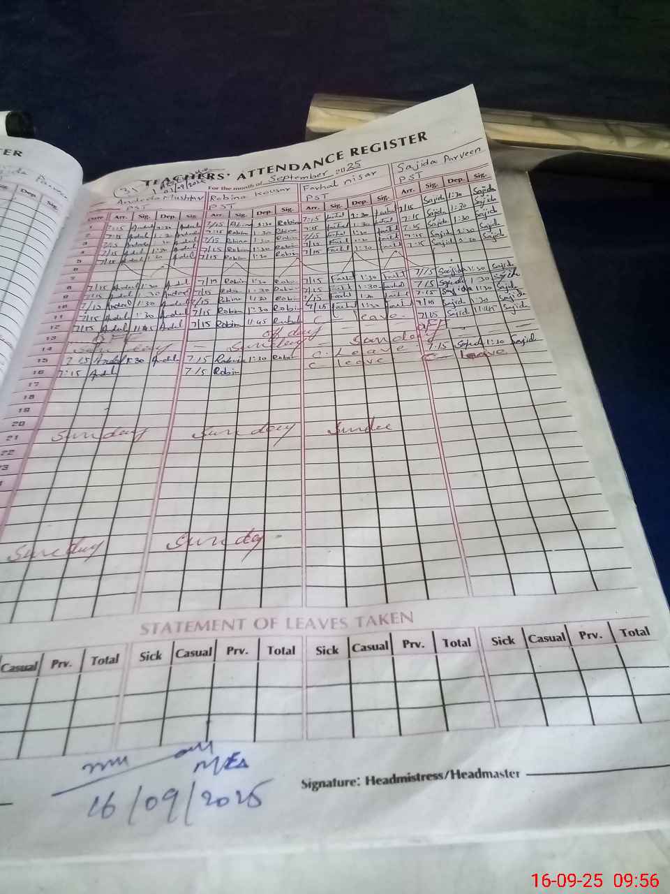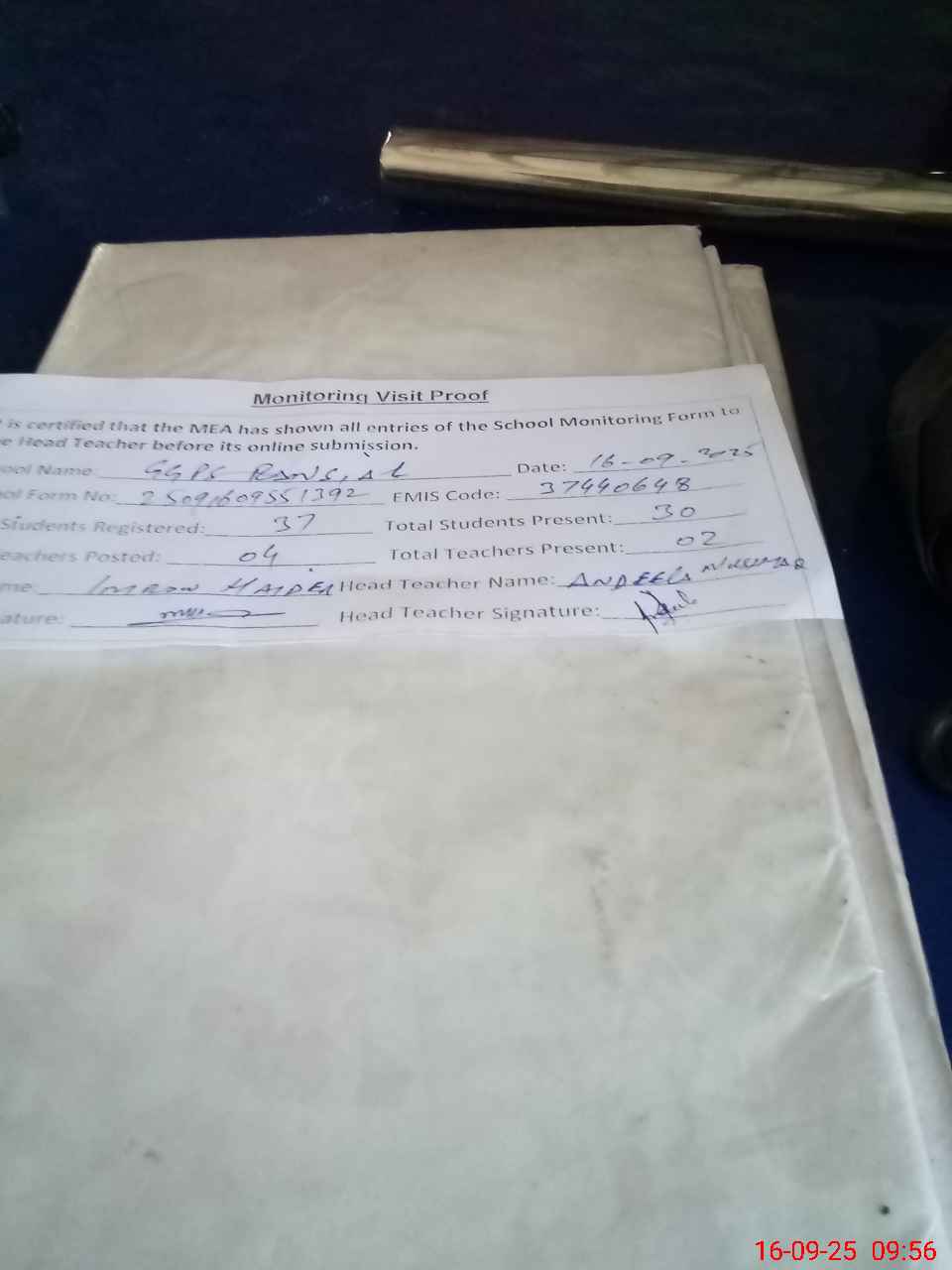 | Attendance Register | Head Teacher | MEA with School | Visit Proof |