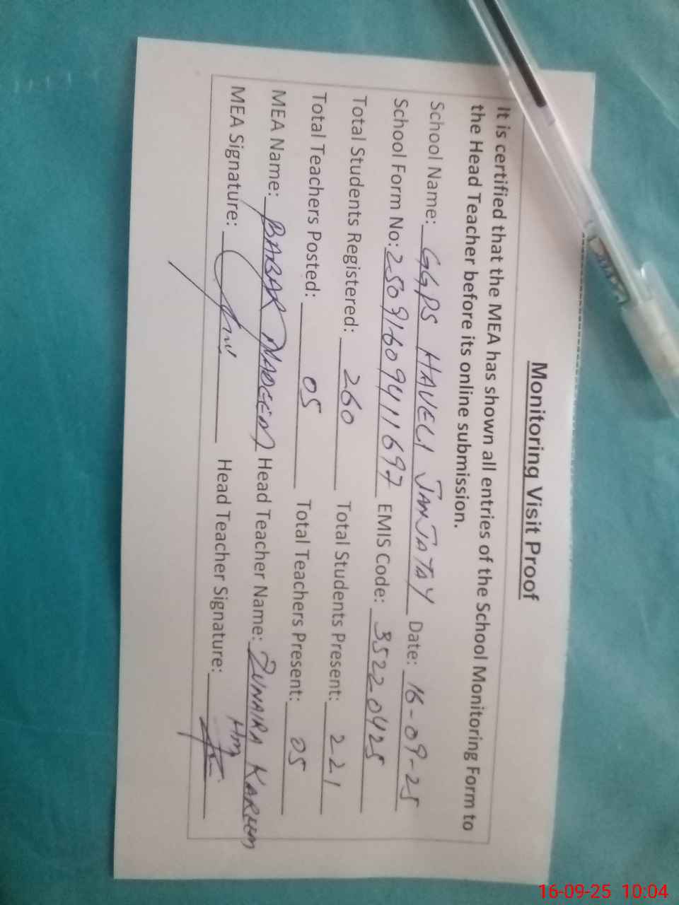 | Remarks (Use Separate Page if Required): 1 Muhammad Naveed SG absent from duty since 20 August 2025 2 The boundary wall needs to be repaired and the barbed wire on the wall at some points is missing 3 The school ground level is lower than surrounding area so that the drainage of rain water is not possible | |||||