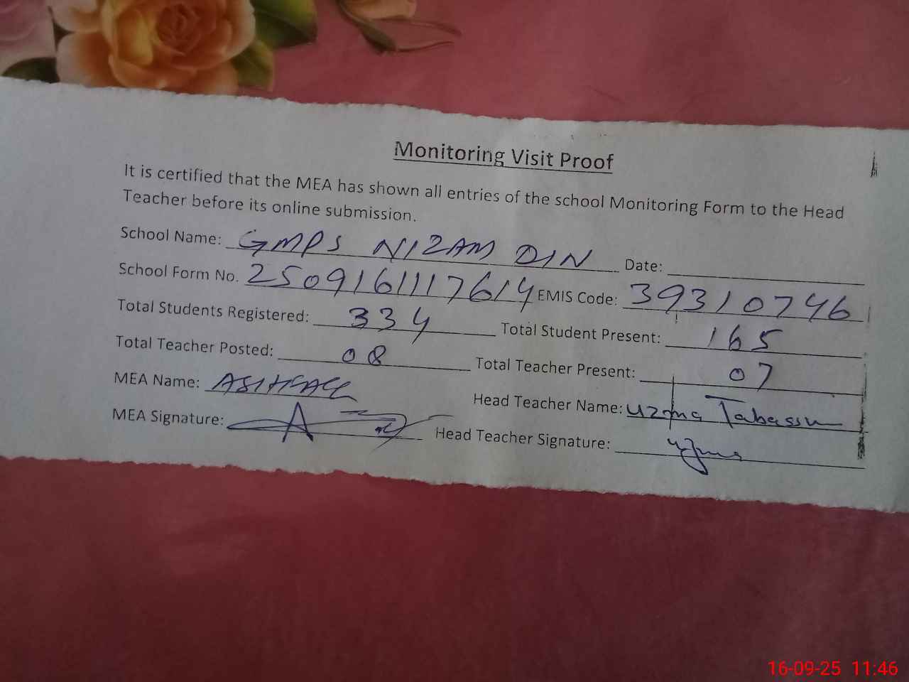 | EMIS Code: 39310746 | Name of School: GMPS NIZAM DIN | |||
