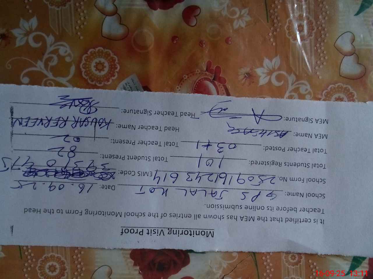 | Attendance Register | Head Teacher | MEA with School | Visit Proof |