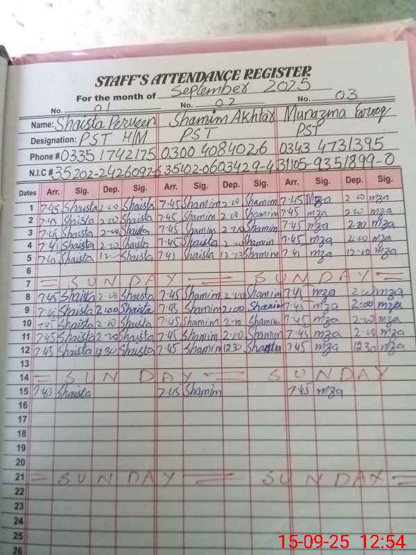| Name: SH**** PA**** Designation: (School Headmaster's/Headmistress's) Head Mistress Phone/Cell Number: 03**** |