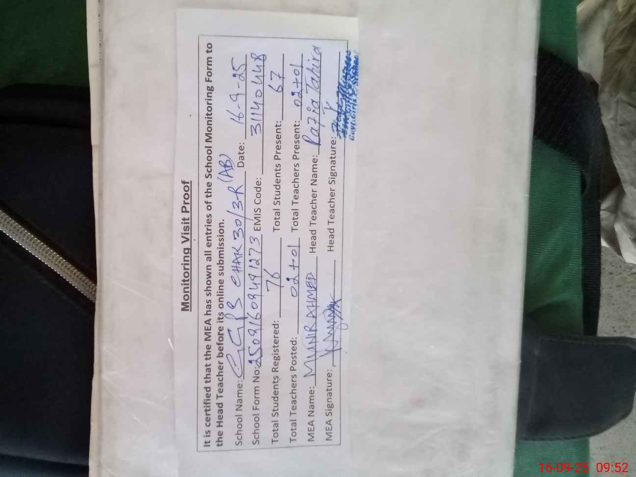 | Attendance Register | Head Teacher | MEA with School | Visit Proof |