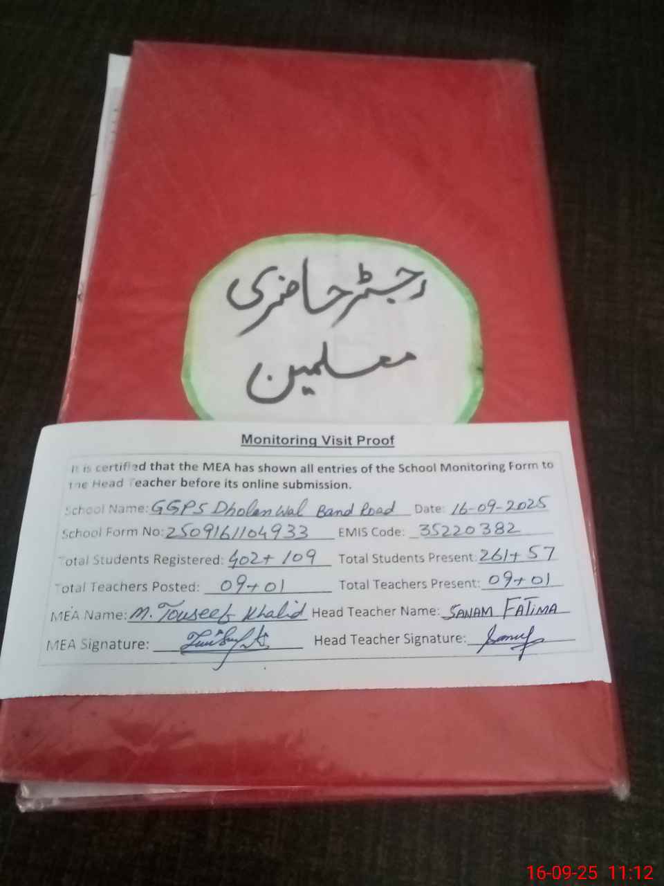 | Attendance Register | Head Teacher | MEA with School | Visit Proof |