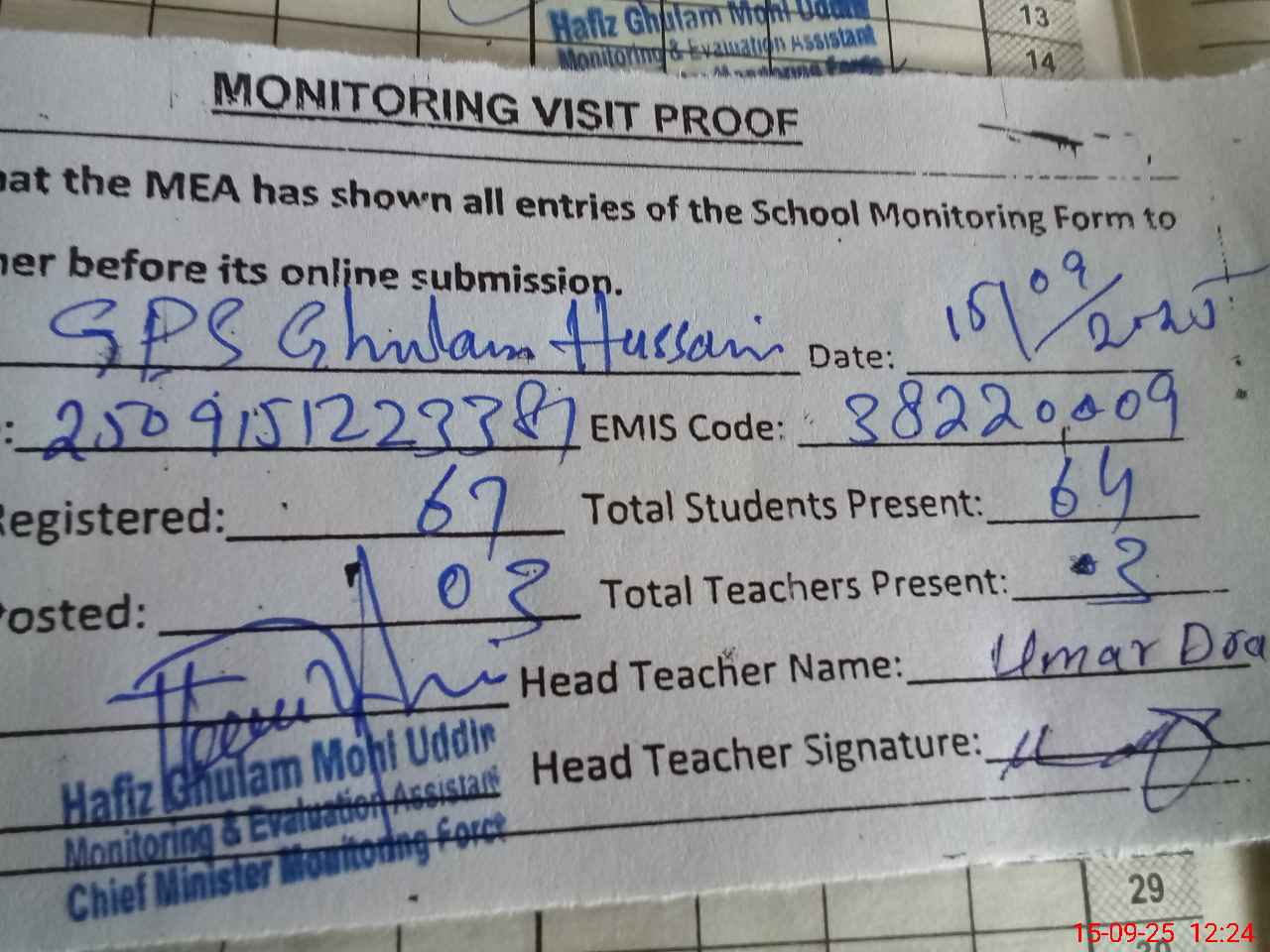 | Attendance Register | Head Teacher | MEA with School | Visit Proof |