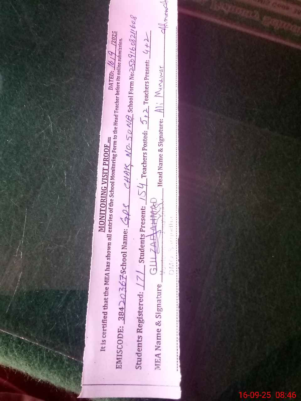 | Monitoring Date: 16-09-2025 | Start Time: 16-09-2025 08:21 AM | End Time: 16-09-2025 08:52 AM | Name of MEA: GU**** AH**** | |