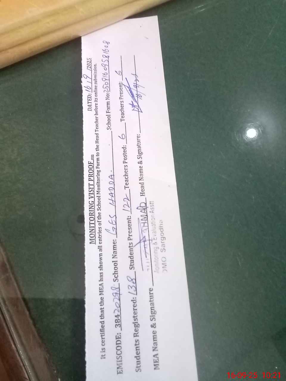 | Attendance Register | Head Teacher | MEA with School | Visit Proof |