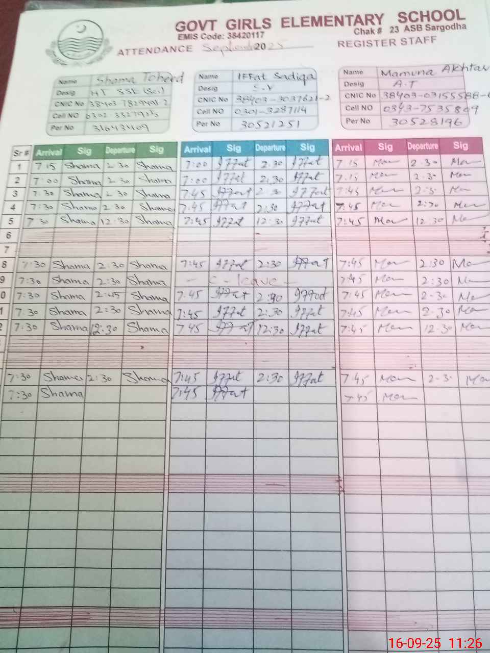 | CNIC | Full Name | Designation | R/C | Absence during last cal. month |