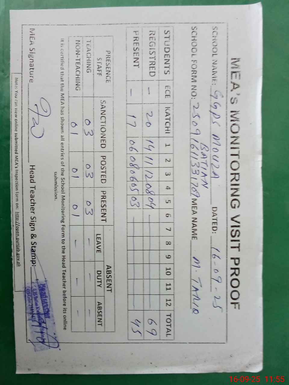| Attendance Register | Head Teacher | MEA with School | Visit Proof |
