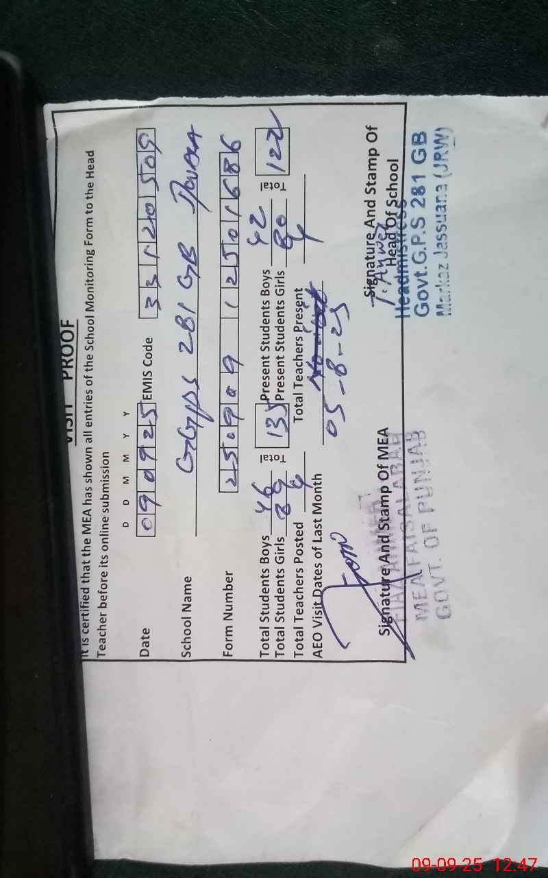 | EMIS Code: 33120509 | Name of School: GGPS CHAK 281 GB SATIANA | |||