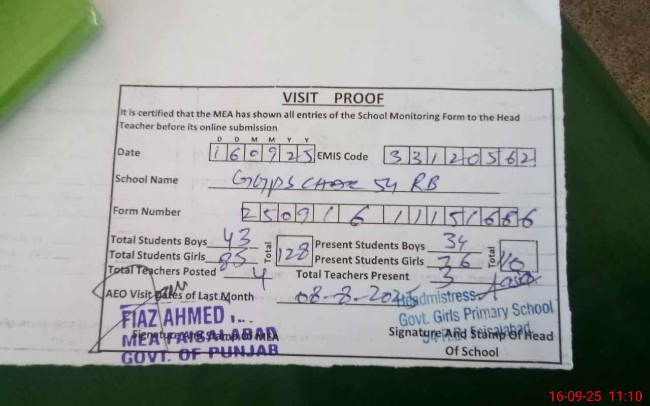| EMIS Code: 33120562 | Name of School: GGPS CHAK NO 54 RB | |||