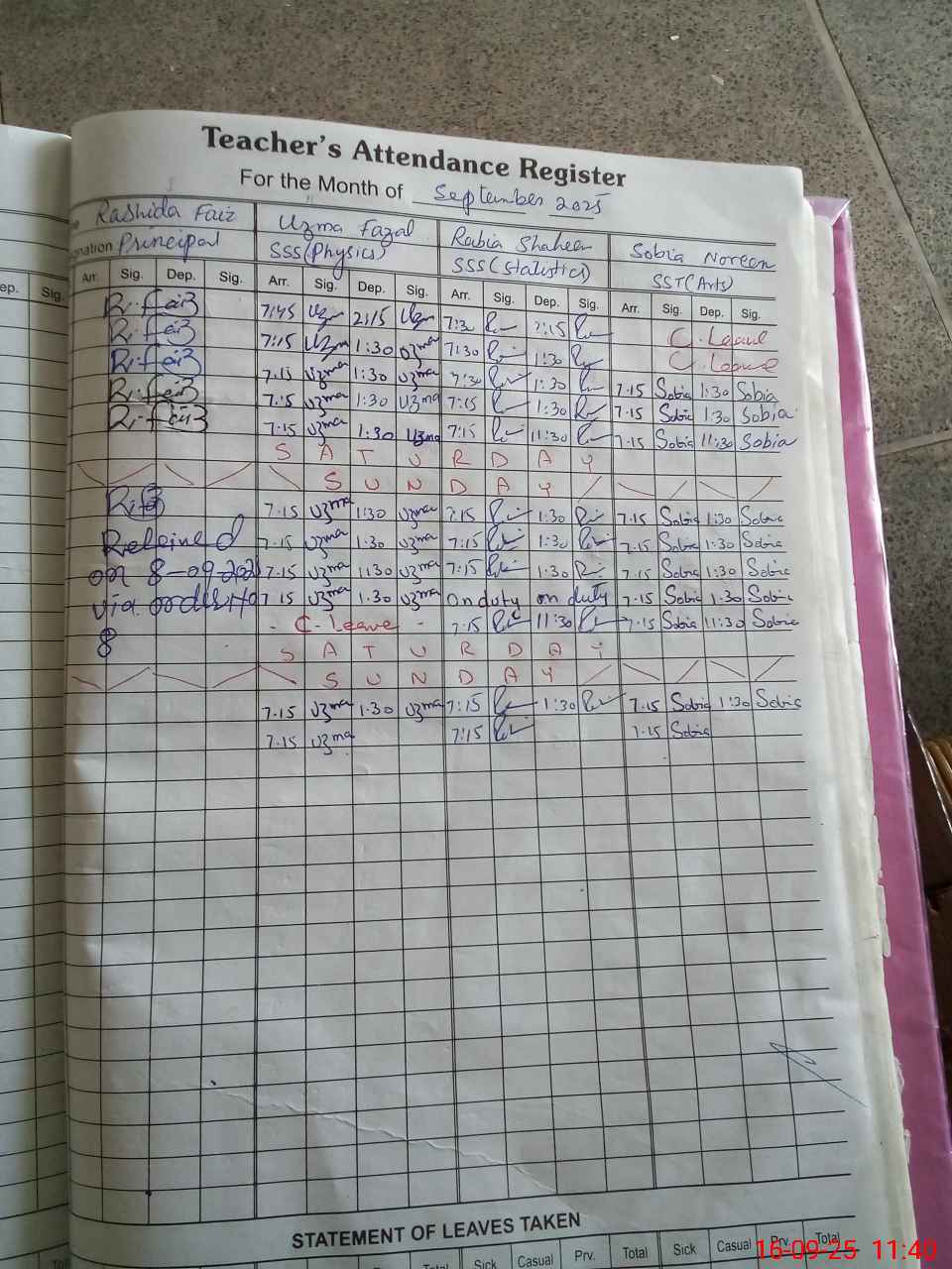 | Leave | Duty | Absent | Maternity | Medical | Ex- Pak |
