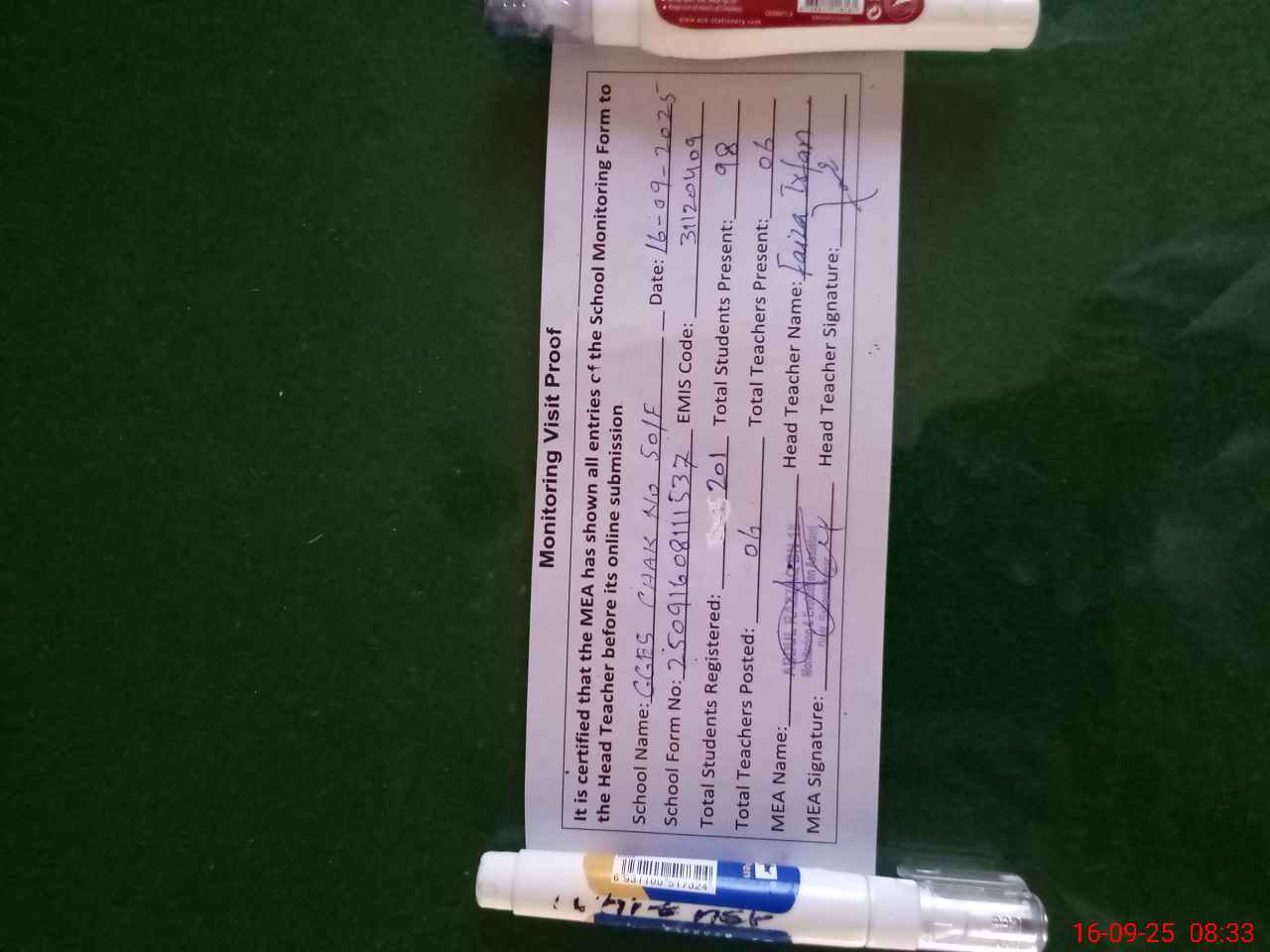 | Attendance Register | Head Teacher | MEA with School | Visit Proof |