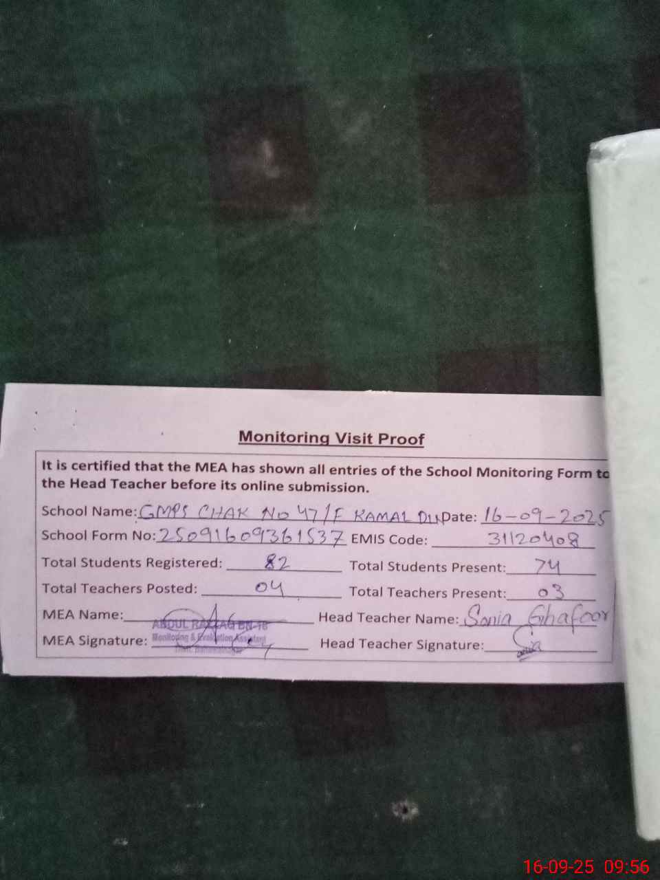 | Attendance Register | Head Teacher | MEA with School | Visit Proof |