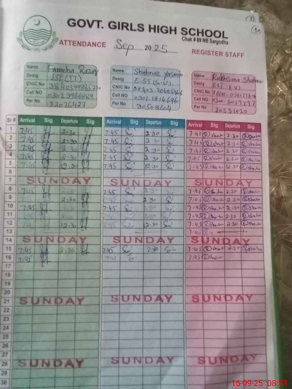| CNIC | Full Name | Designation | R/C | Absence during last cal. month |
