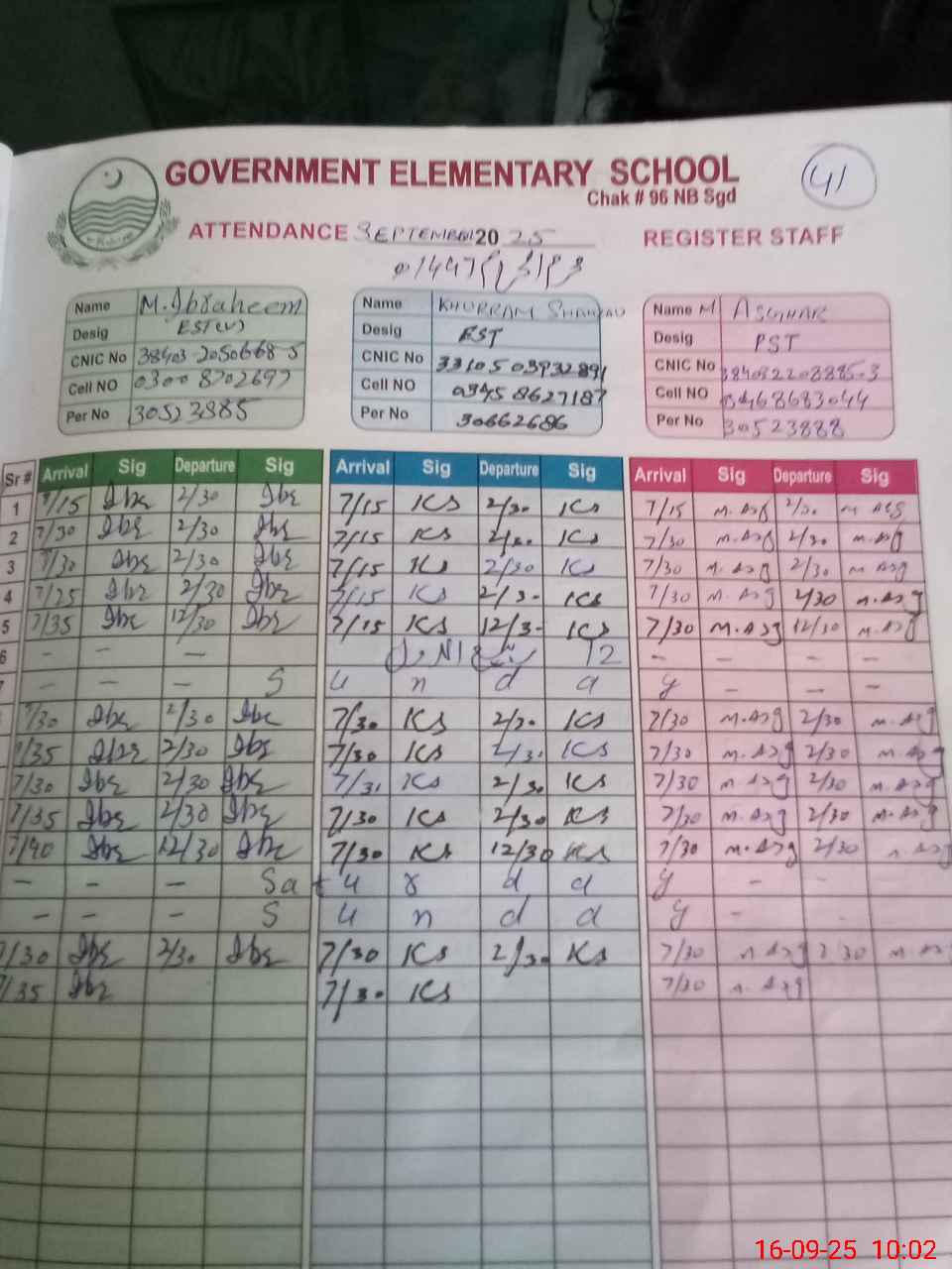 | CNIC | Full Name | Designation | R/C | Absence during last cal. month |