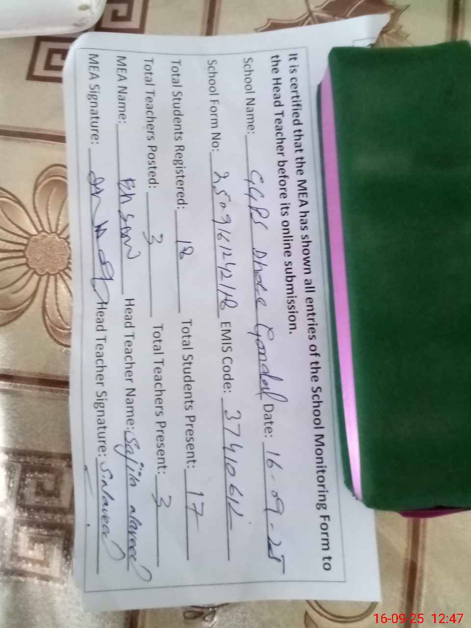 | EMIS Code: 37410612 | Name of School: GGPS DHOK GONDAL P/O DULLAH | |||