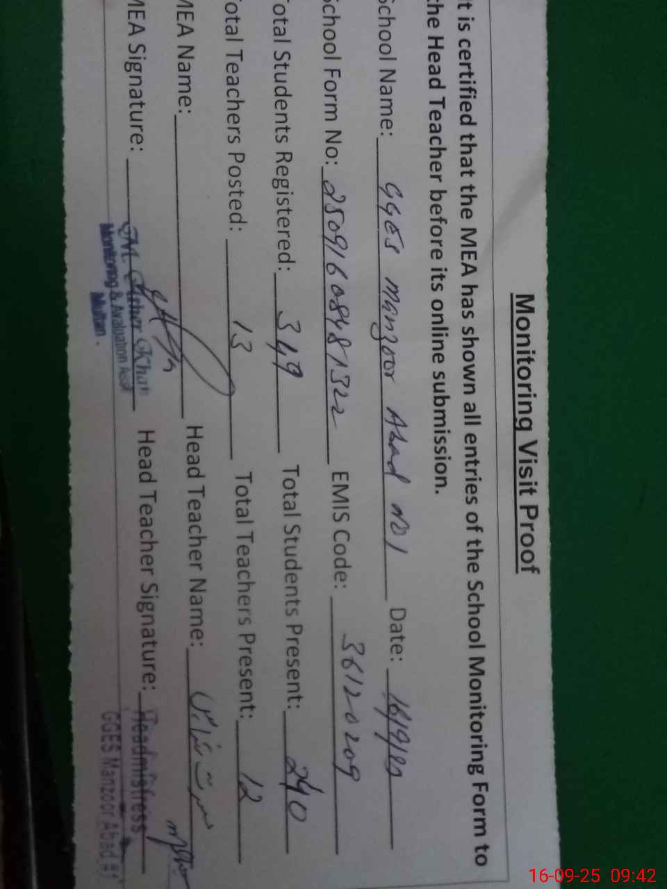 | Certified that this School was Inspected by the Undersigned MEA/DMO Today and the Information Stated Above is as Per Record. | |||||