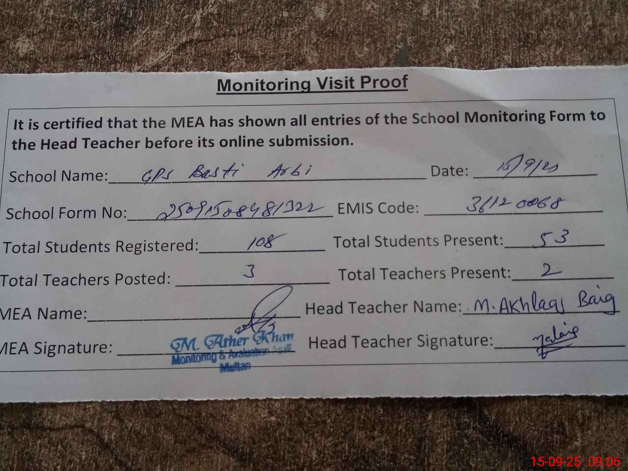 | EMIS Code: 36120068 | Name of School: GPS BASTI ARBI P/O SHUJABAD MOZA GAJU HATTA | |||