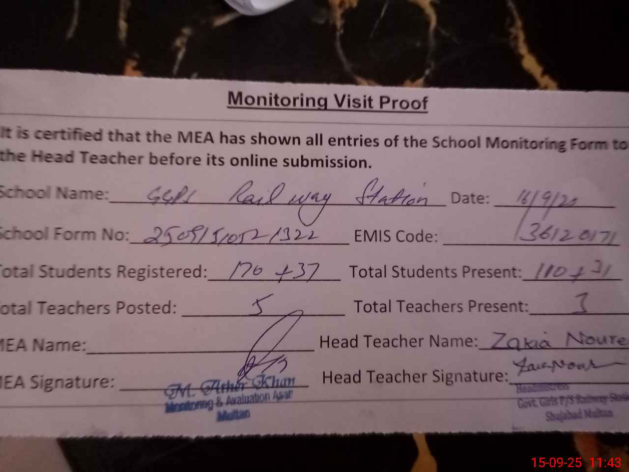 | Attendance Register | Head Teacher | MEA with School | Visit Proof |