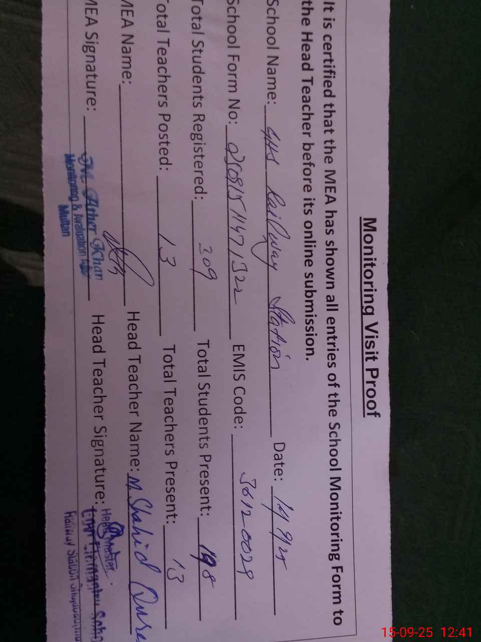 | Attendance Register | Head Teacher | MEA with School | Visit Proof |