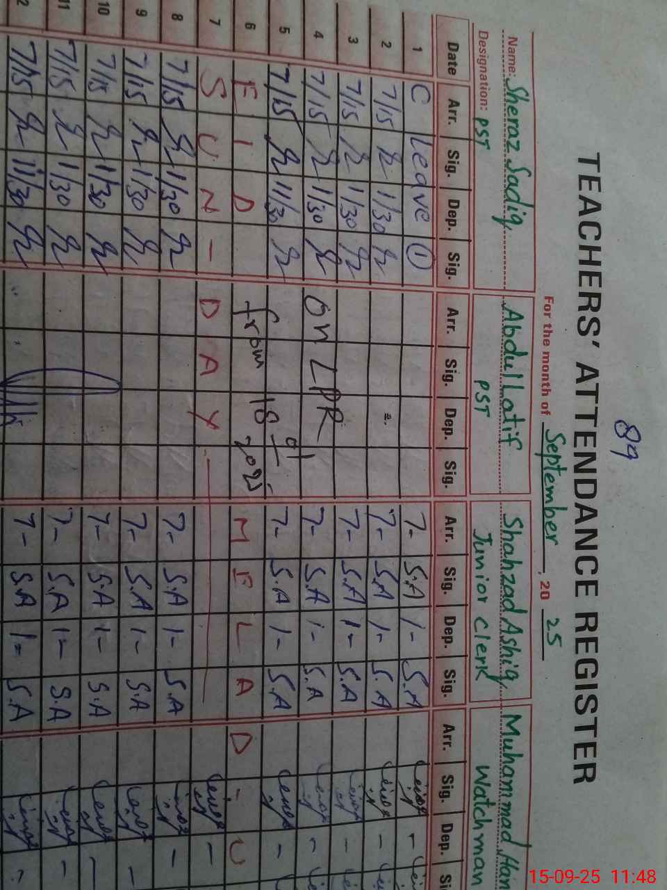 | CNIC | Full Name | Designation | R/C | Absence During Last Calender Month |