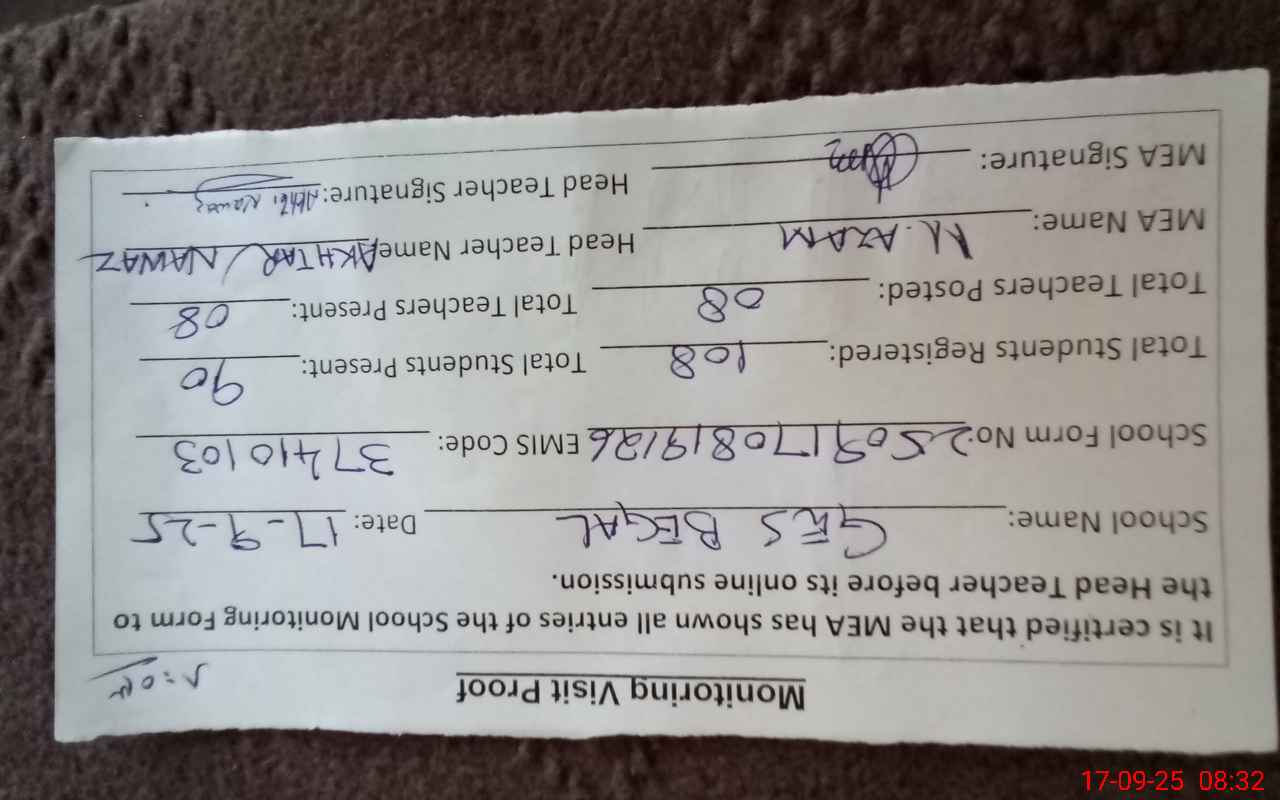 | Attendance Register | Head Teacher | MEA with School | Visit Proof |
