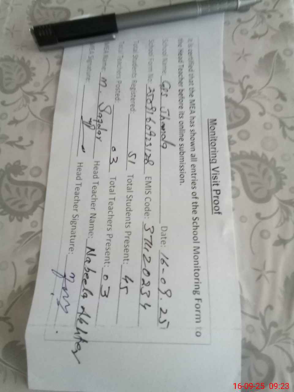 | Attendance Register | Head Teacher | MEA with School | Visit Proof |