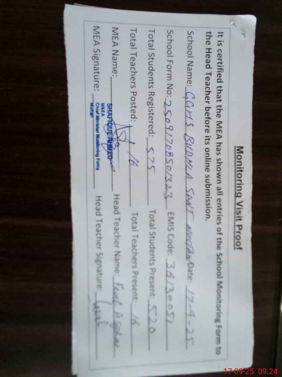 | Certified that this School was Inspected by the Undersigned MEA/DMO Today and the Information Stated Above is as Per Record. | |||||