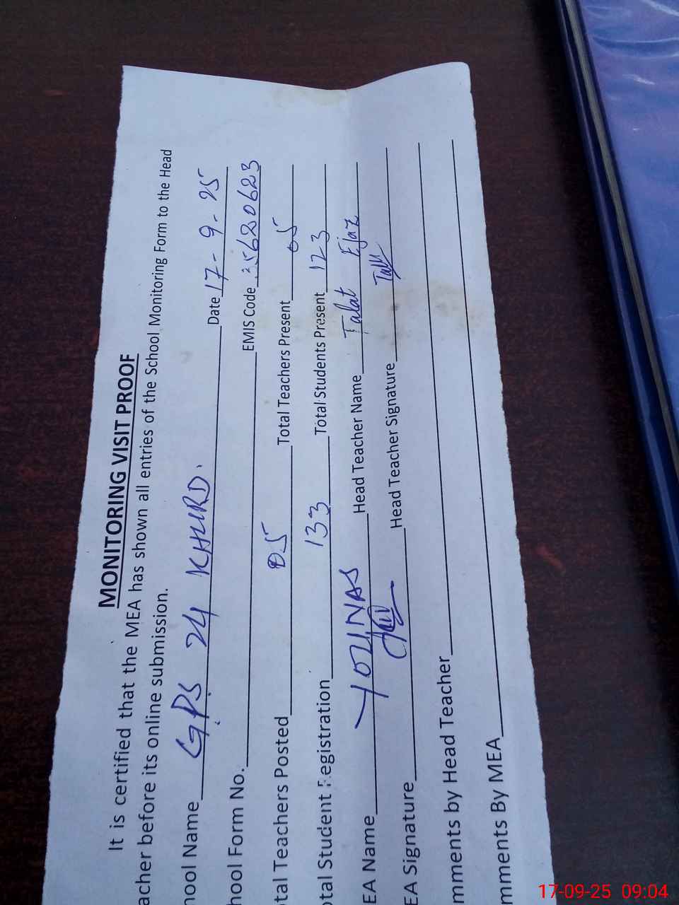 | Attendance Register | Head Teacher | MEA with School | Visit Proof |