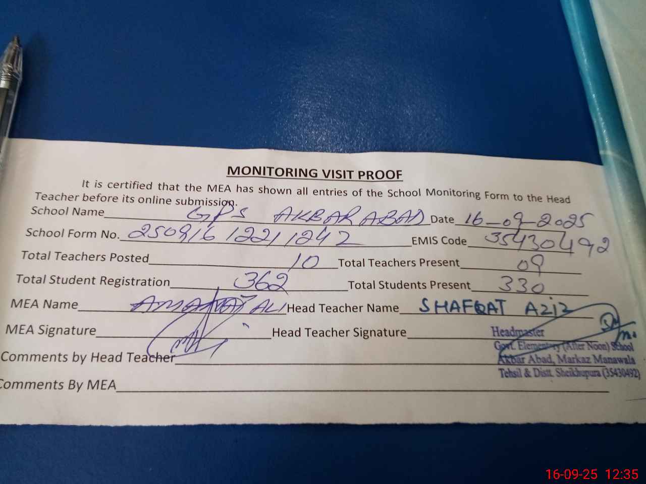 | Attendance Register | Head Teacher | MEA with School | Visit Proof |