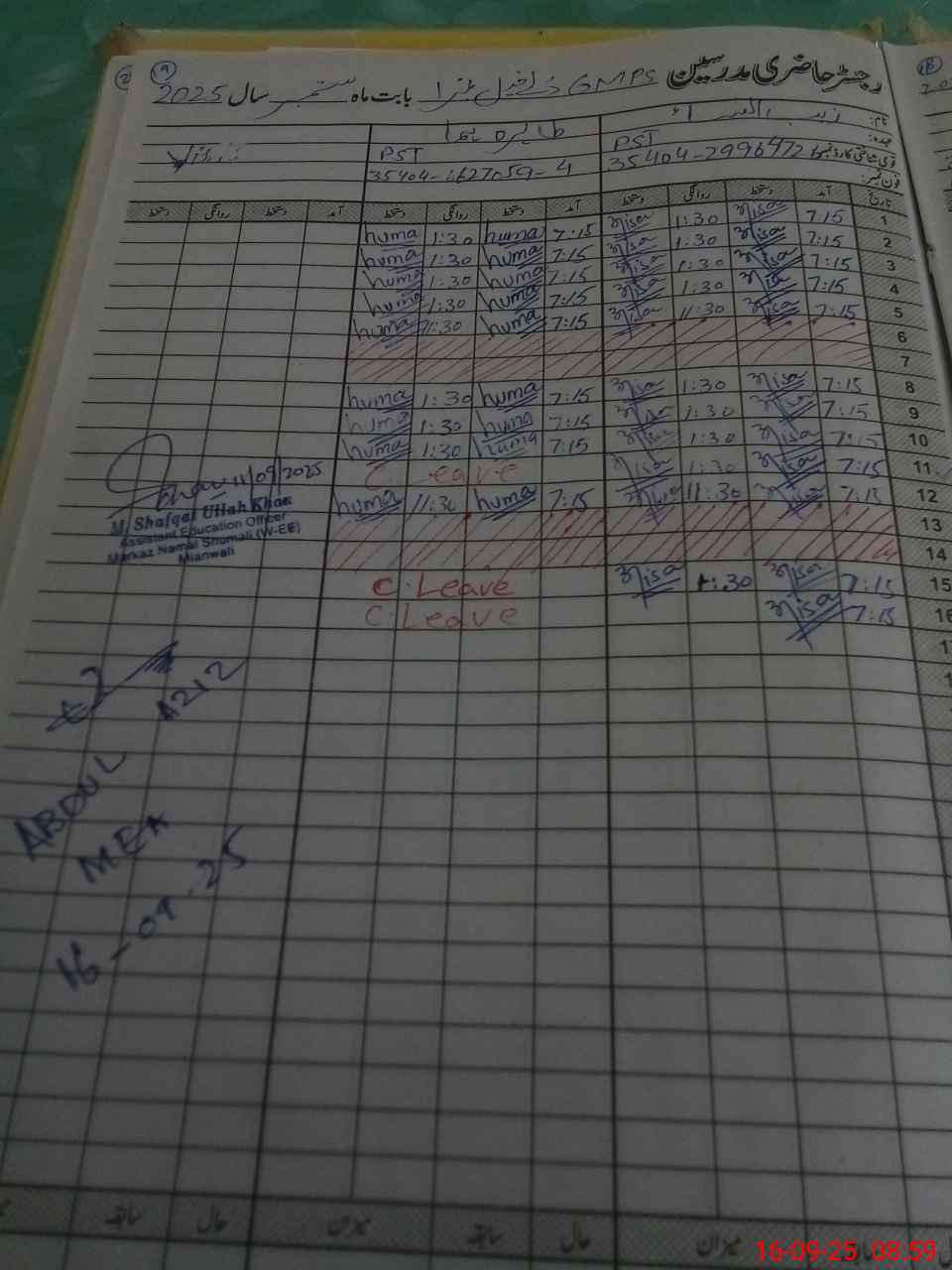 | Name: Kh**** Be**** Designation: (School Headmaster's/Headmistress's) PST Phone/Cell Number: 03**** |