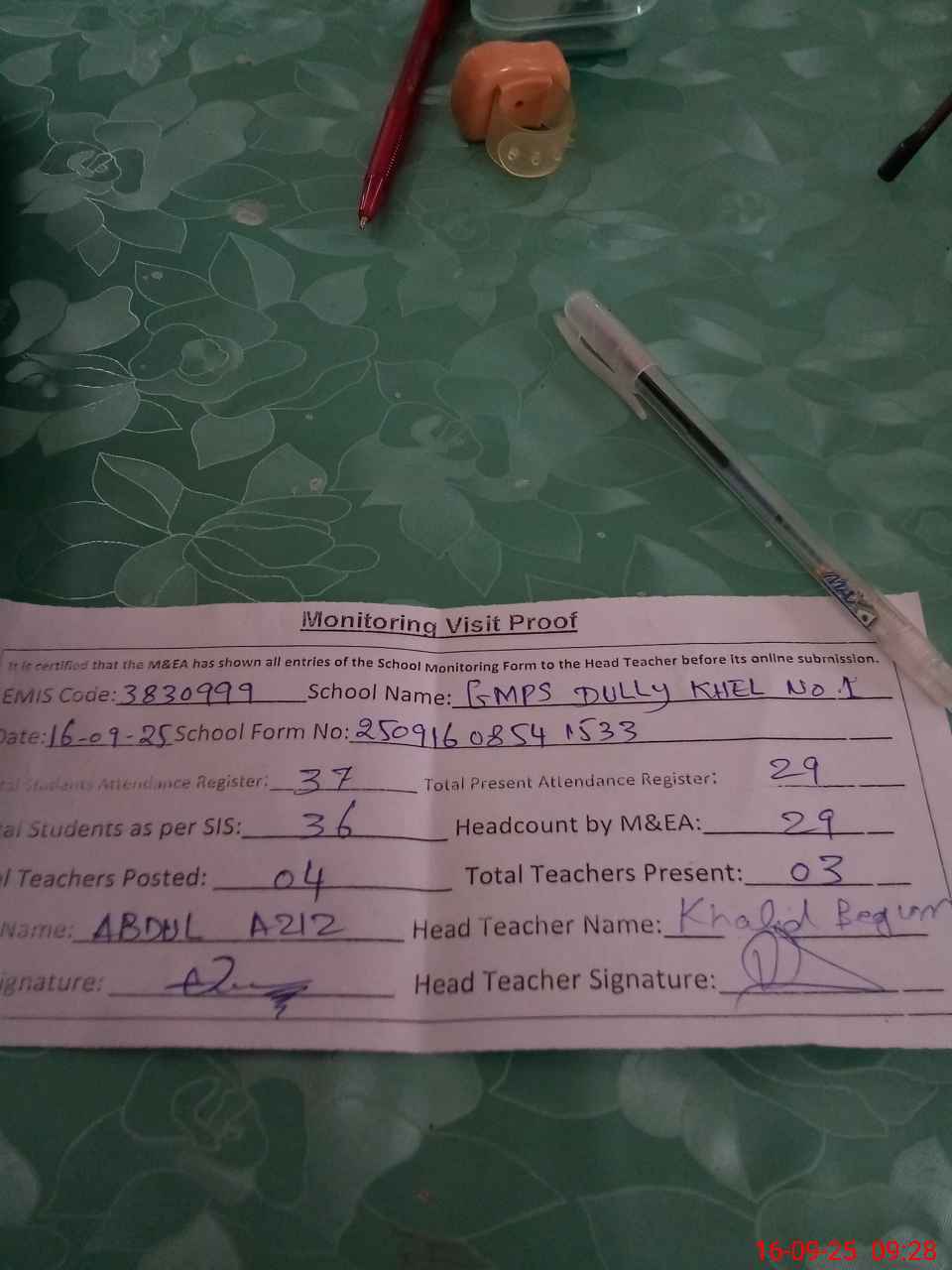 | Attendance Register | Head Teacher | MEA with School | Visit Proof |