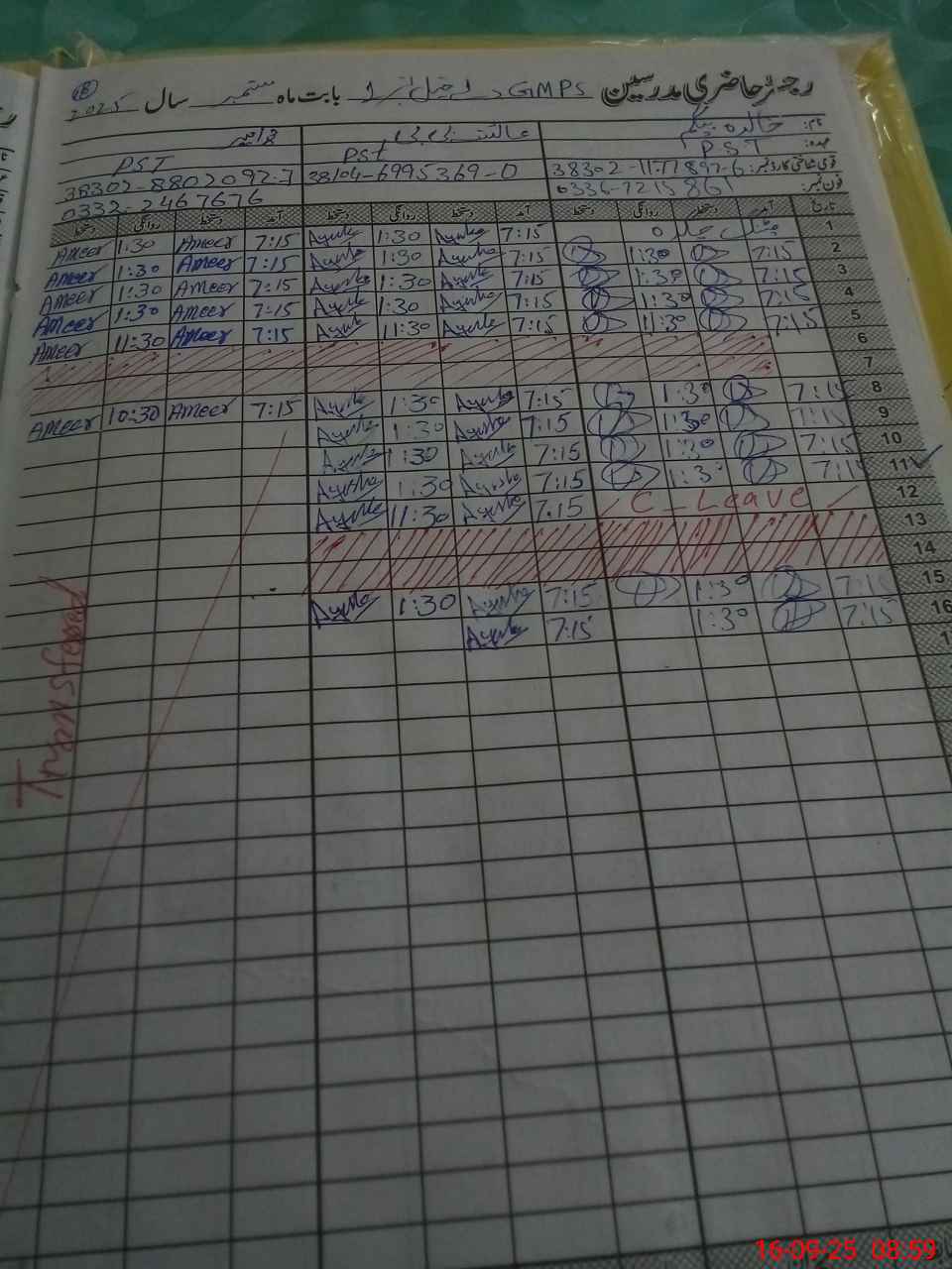 | CNIC | Full Name | Designation | R/C | Absence during last cal. month |