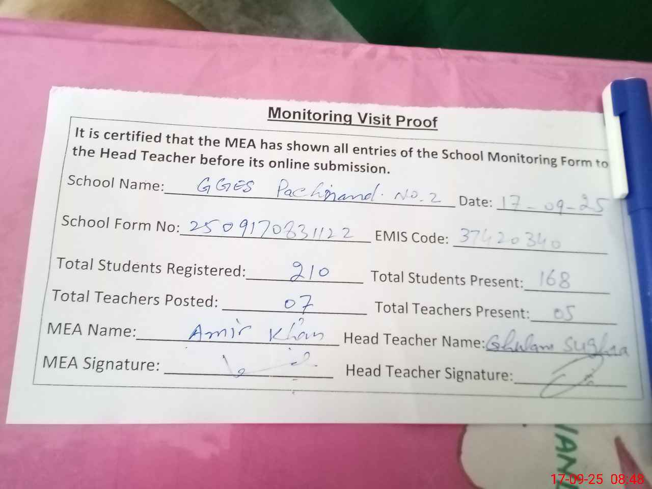 | Attendance Register | Head Teacher | MEA with School | Visit Proof |