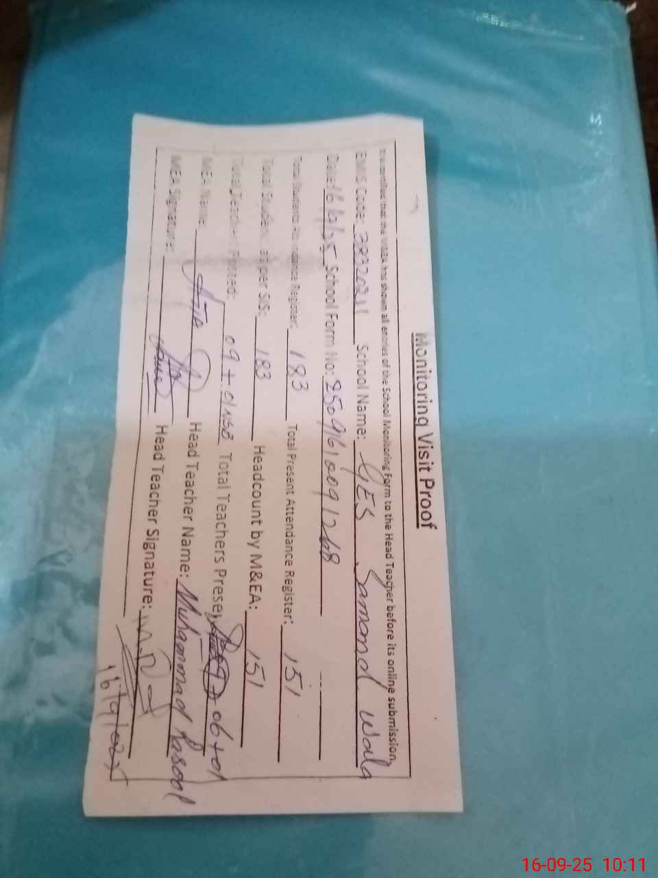 | Attendance Register | Head Teacher | MEA with School | Visit Proof |