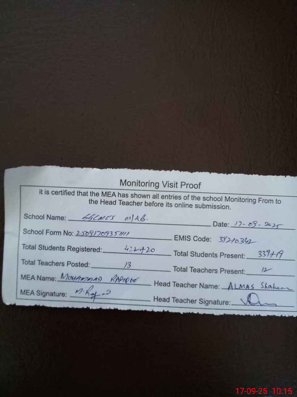 | Attendance Register | Head Teacher | MEA with School | Visit Proof |