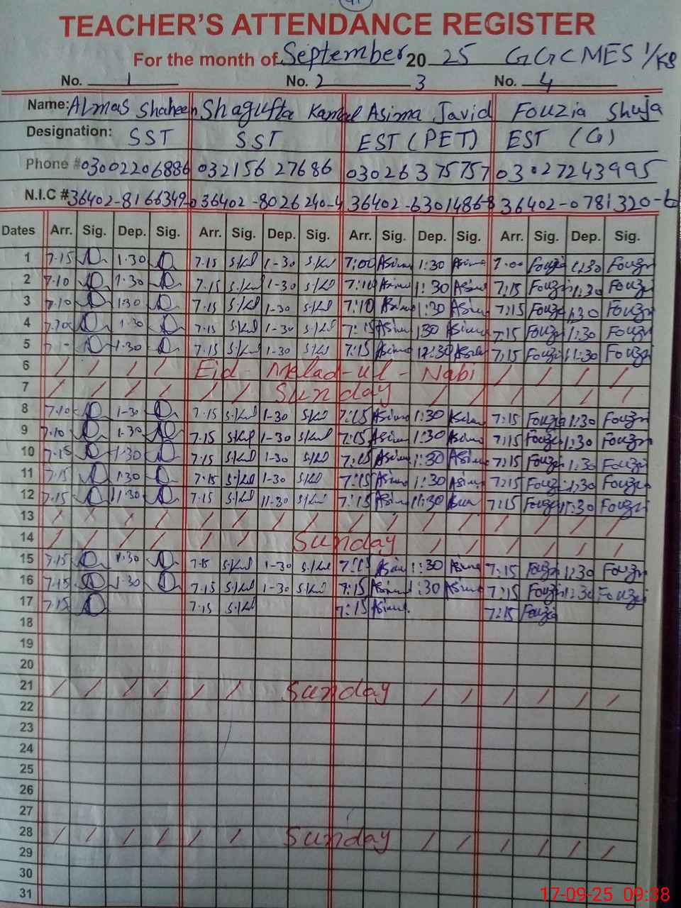 | CNIC | Full Name | Designation | R/C | Absence during last cal. month |