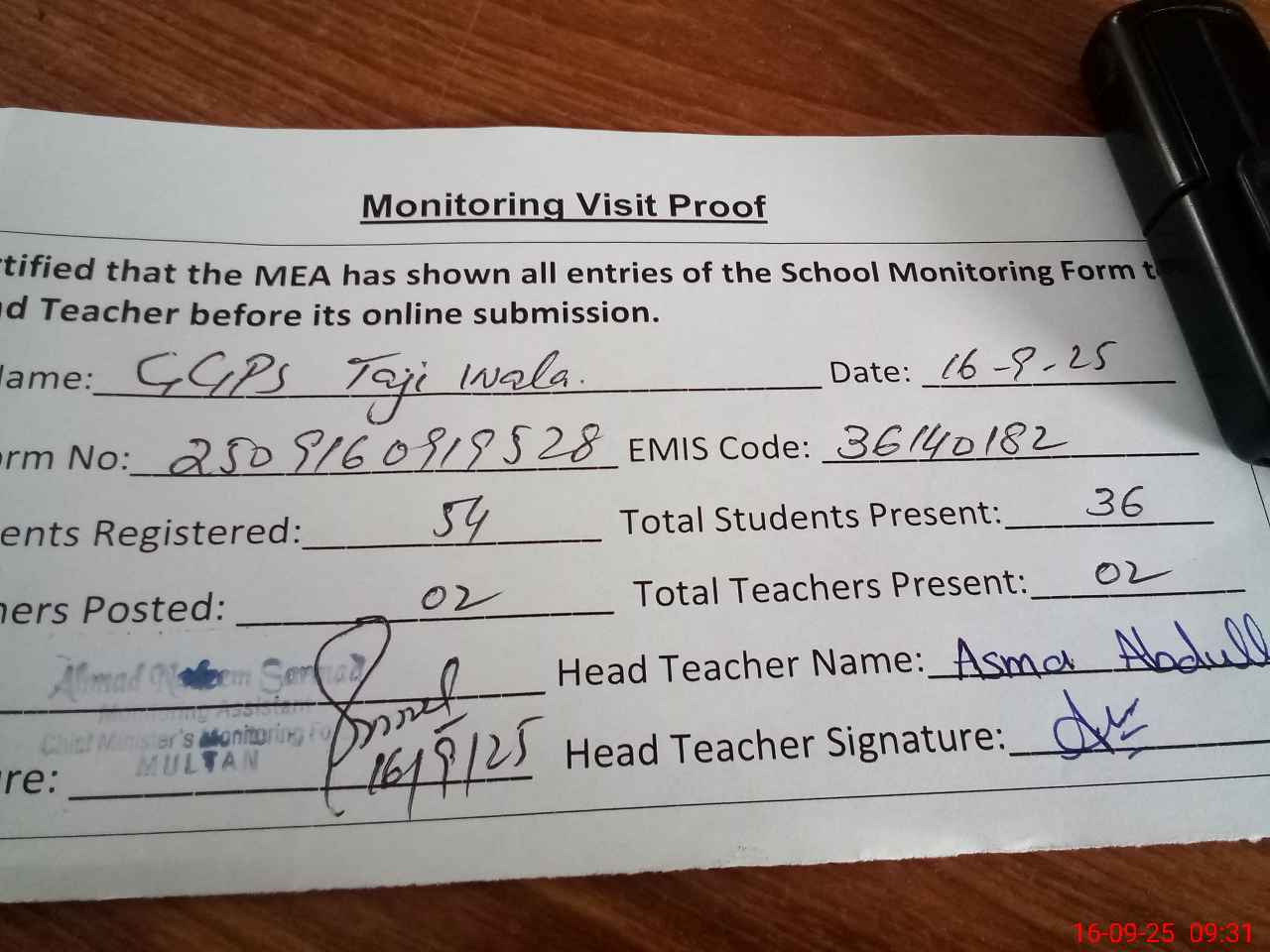| Attendance Register | Head Teacher | MEA with School | Visit Proof |