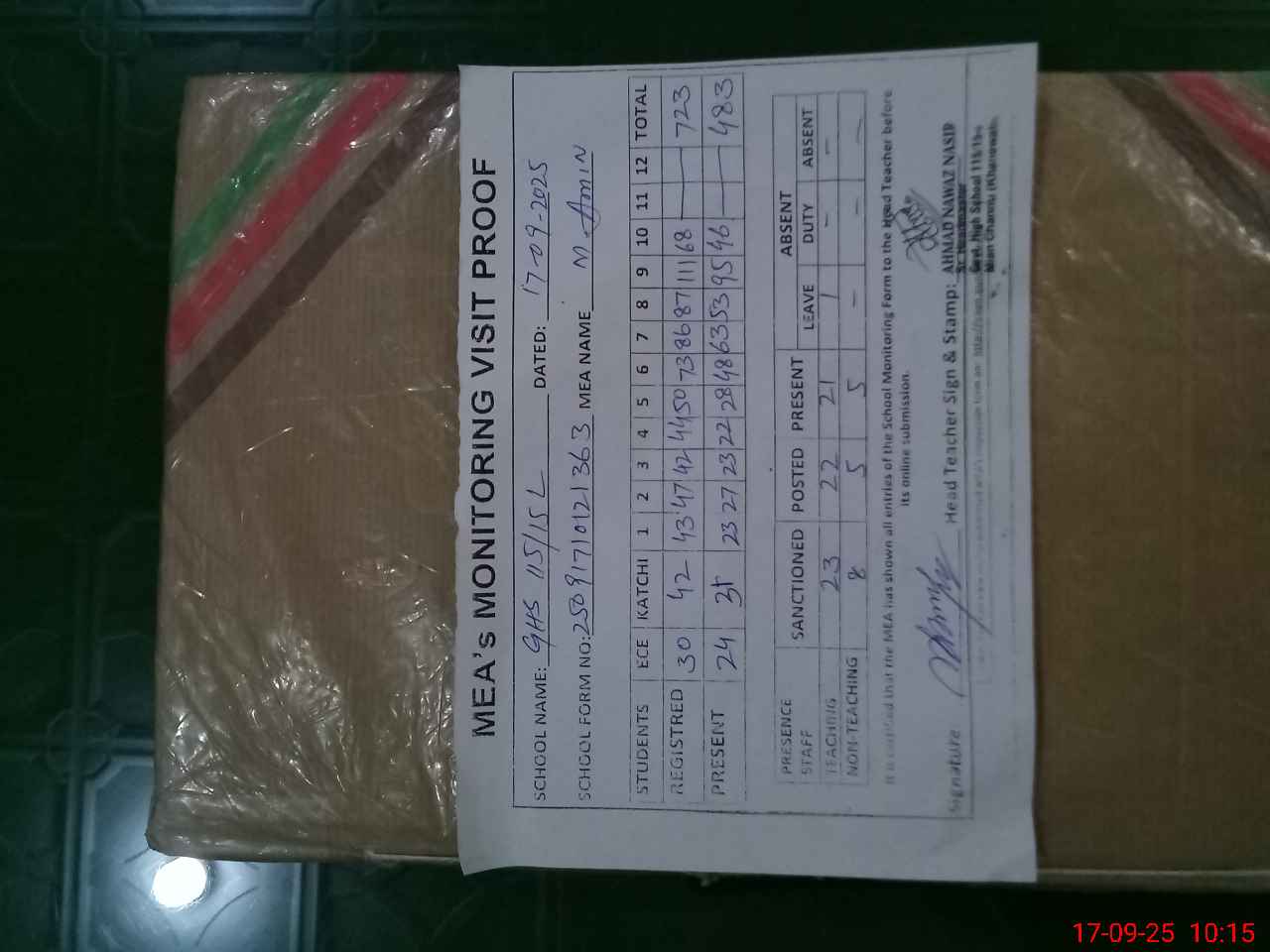 | Attendance Register | Head Teacher | MEA with School | Visit Proof |