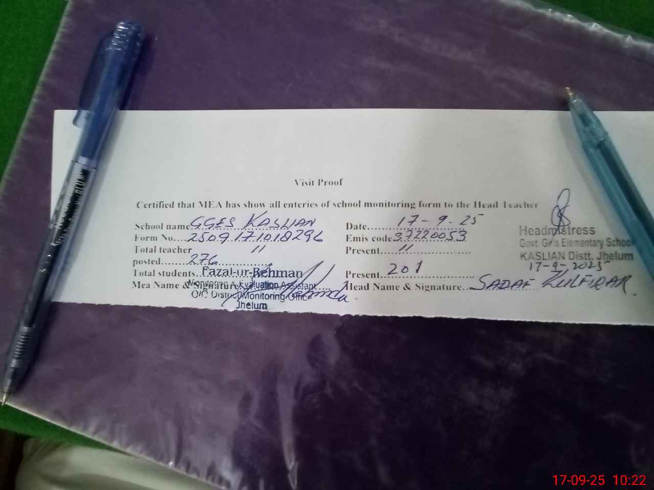 | Attendance Register | Head Teacher | MEA with School | Visit Proof |