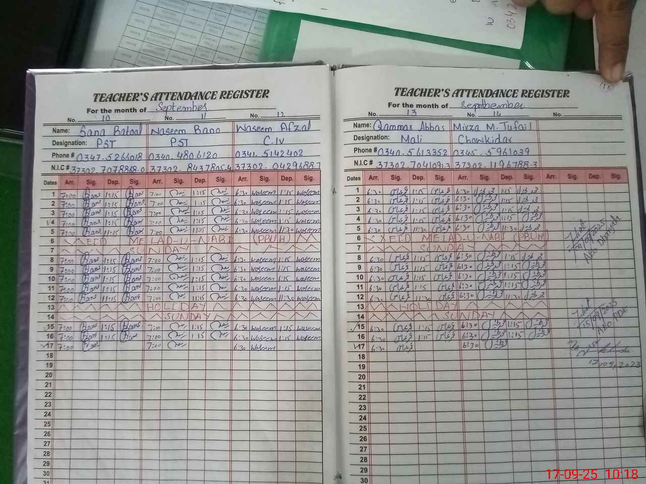 | CNIC | Full Name | Designation | R/C | Absence during last cal. month |