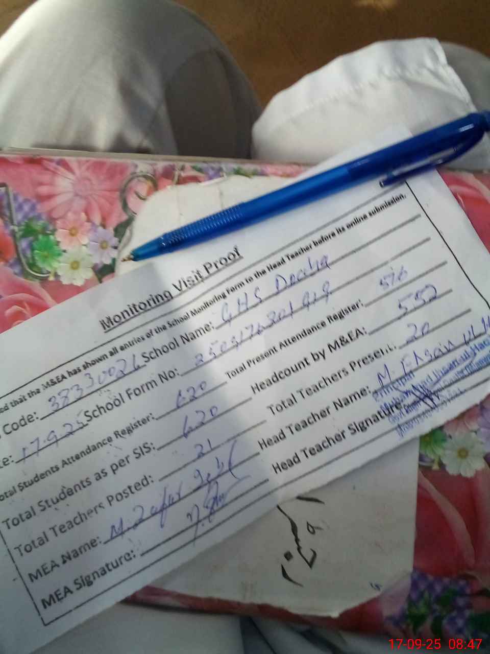 | Attendance Register | Head Teacher | MEA with School | Visit Proof |