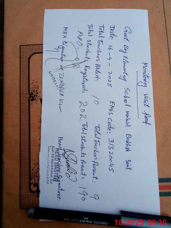 | Attendance Register | Head Teacher | MEA with School | Visit Proof |