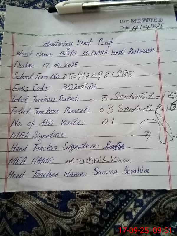 | EMIS Code: 31320486 | Name of School: GGPS MUHAMMAD DAHA BASTI BABRAN | |||