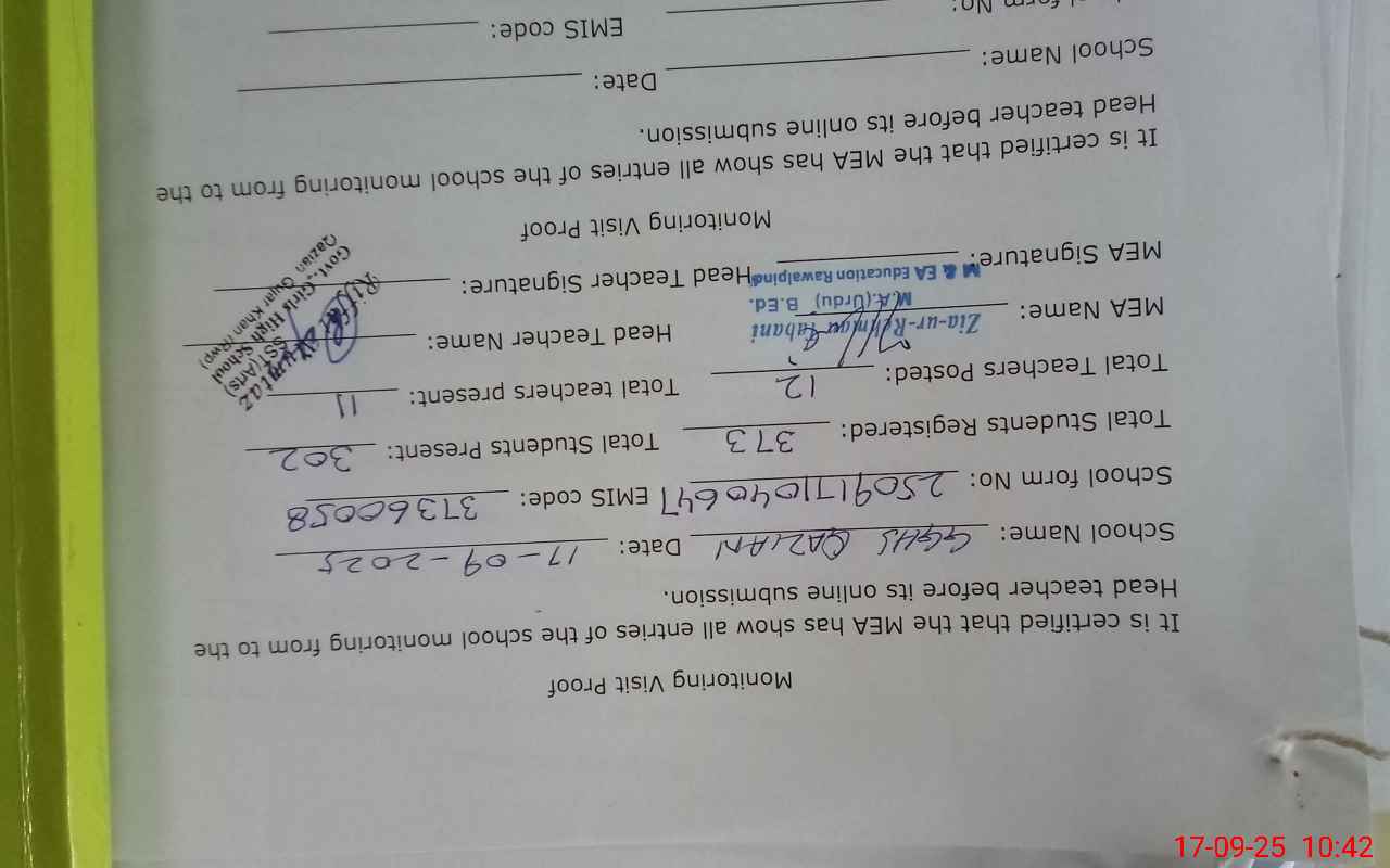 | Attendance Register | Head Teacher | MEA with School | Visit Proof |