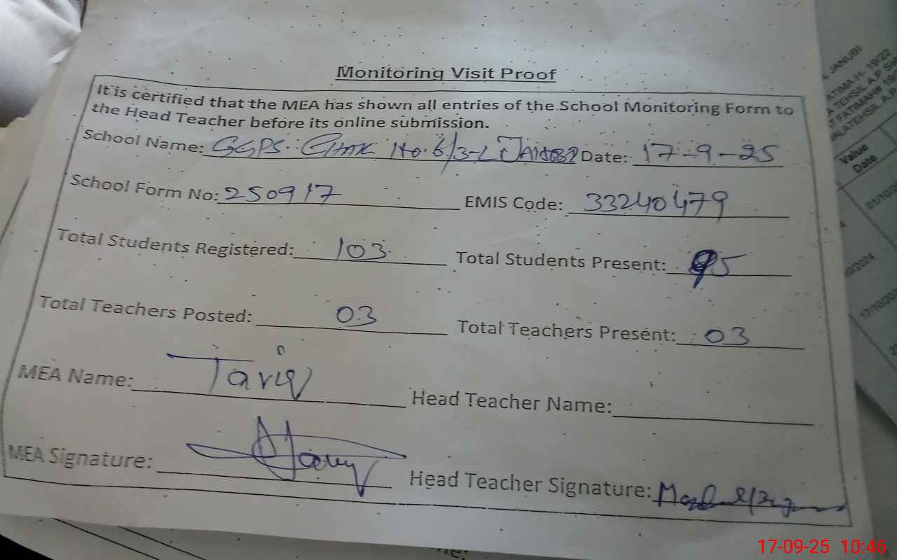| Attendance Register | Head Teacher | MEA with School | Visit Proof |