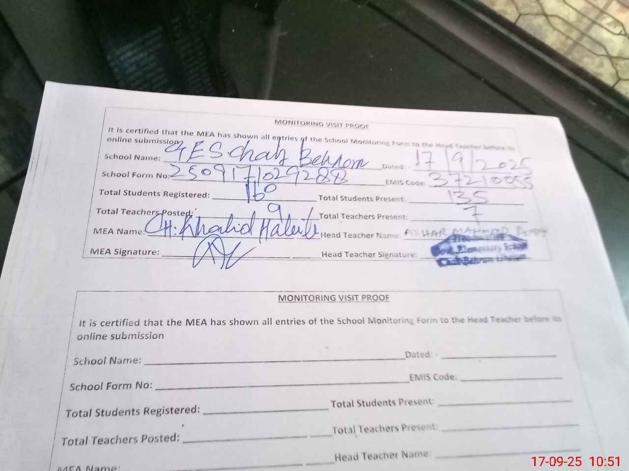 | Attendance Register | Head Teacher | MEA with School | Visit Proof |